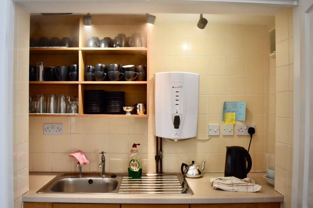 Behind the doors in the Community Room, ideal for making drinks when using that room or the Worship Room.