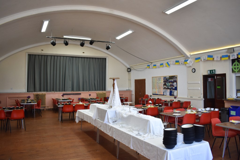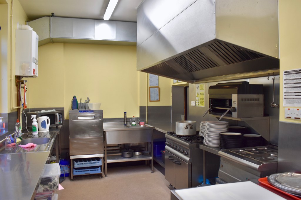 The Main Hall has capacity for 150 people, alongside a stage and adjacent kitchen [below].